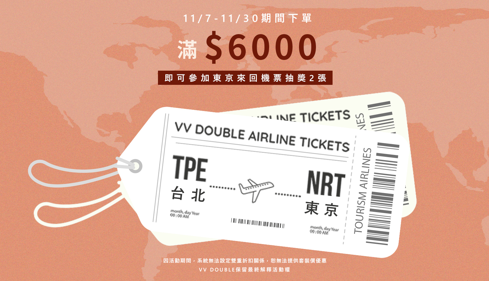 ・本活動係由VV DOUBLE(下稱主辦單位)所舉辦,消費者一般個人資料(包括姓名、地址、電話、e-mail帳號)之蒐集、處理及利用並為連絡及寄送獎項之用。消費者於參加本活動之同時,即同意接受本活動之活動辦法與注意事項之規範,並同意主辦單位蒐集、處理及利用參加人之姓名、地址、電話、e-mail帳號等之一般個人資料,如不同意,恕無法參加活動或獎項寄送。消費者如有違反,主辦單位得取消其參加及得獎資格,並得就因此所產生之損害, 向該消費者請求損害賠償。