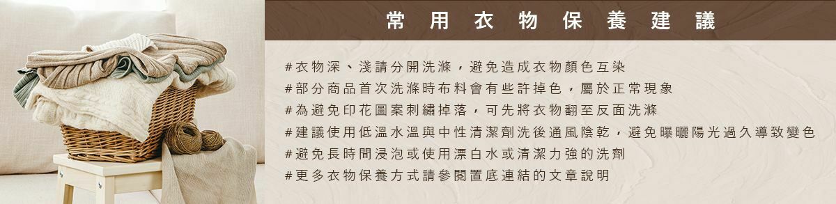| 全平台尺寸皆為平量;單位為公分(cm) 手工測量1-2cm誤差屬正常範圍 ※不可乾洗、不可高溫烘乾、不可氯漂,需隔布整燙※ ※建議可以利用手輕洗,也可用洗衣機清洗但需放入 「洗衣袋」使用「柔洗」模式, 將其破壞性降到最低,洗滌時間建議勿超過30分鐘 ※脫水時間勿過長切勿浸泡※ ※淺色鮮豔衣服請分開洗滌※ |